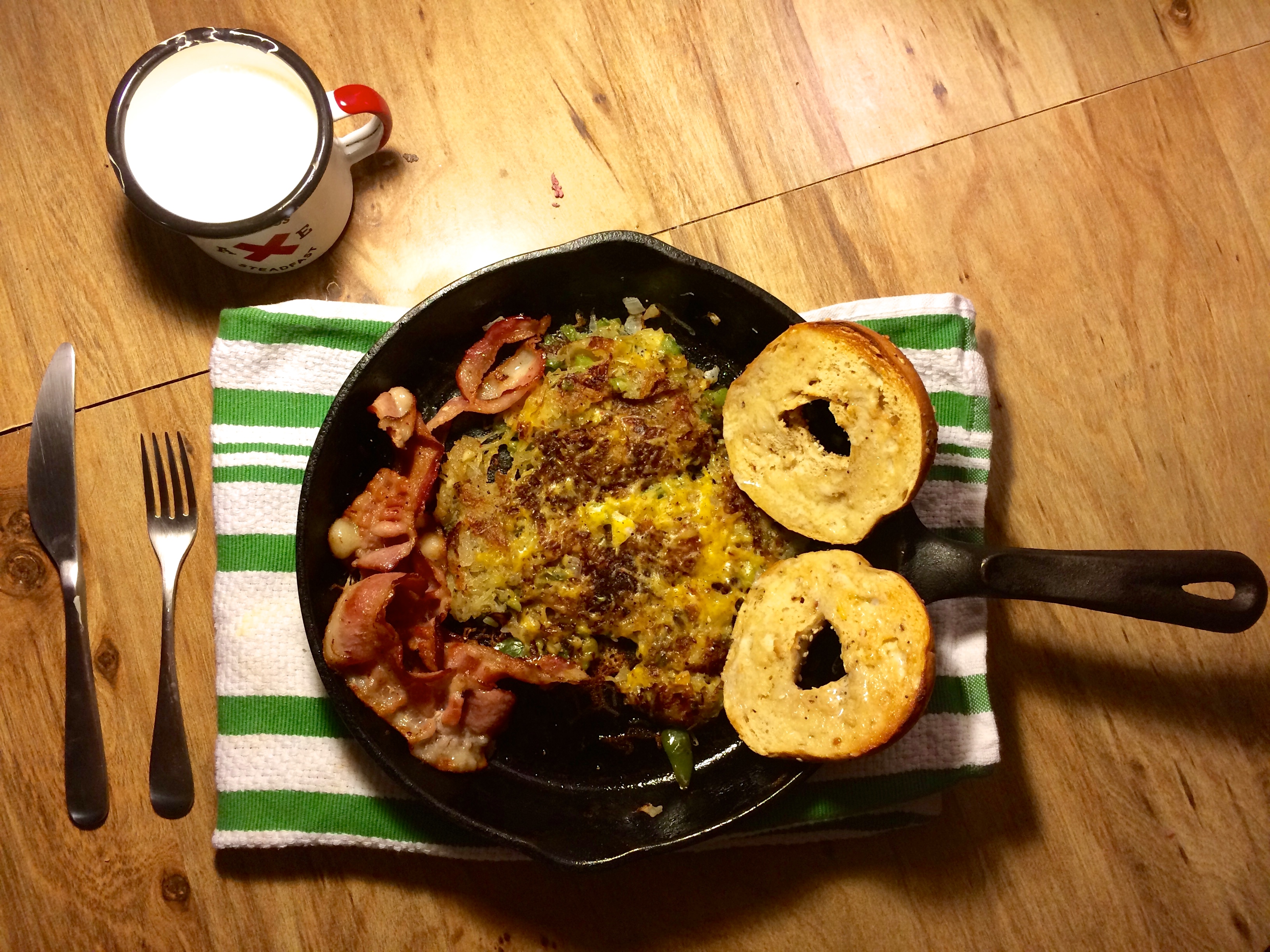 - Season with salt and pepper. Serve immediately and enjoy with bacon and eggs.