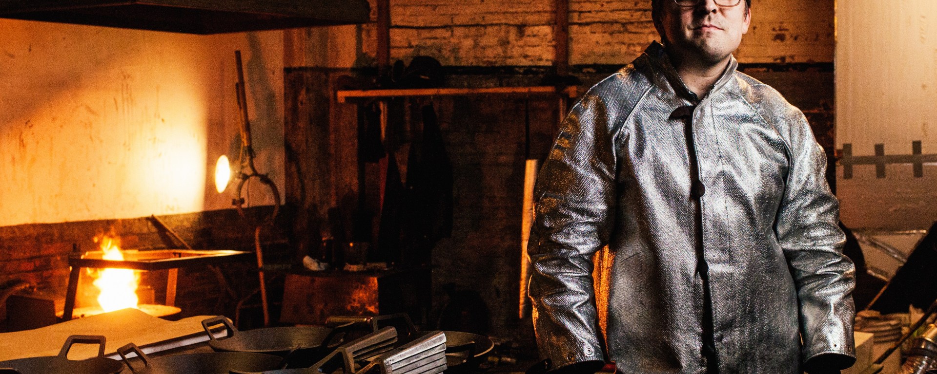 Truex suits up in protective gear to protect his body from “The Skilletron,” the workshop’s handmade furnace.
