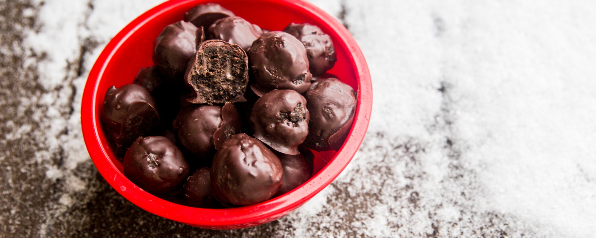 - Remove the cookie sheet from the freezer and dip balls in melted chocolate, placing in a single layer.