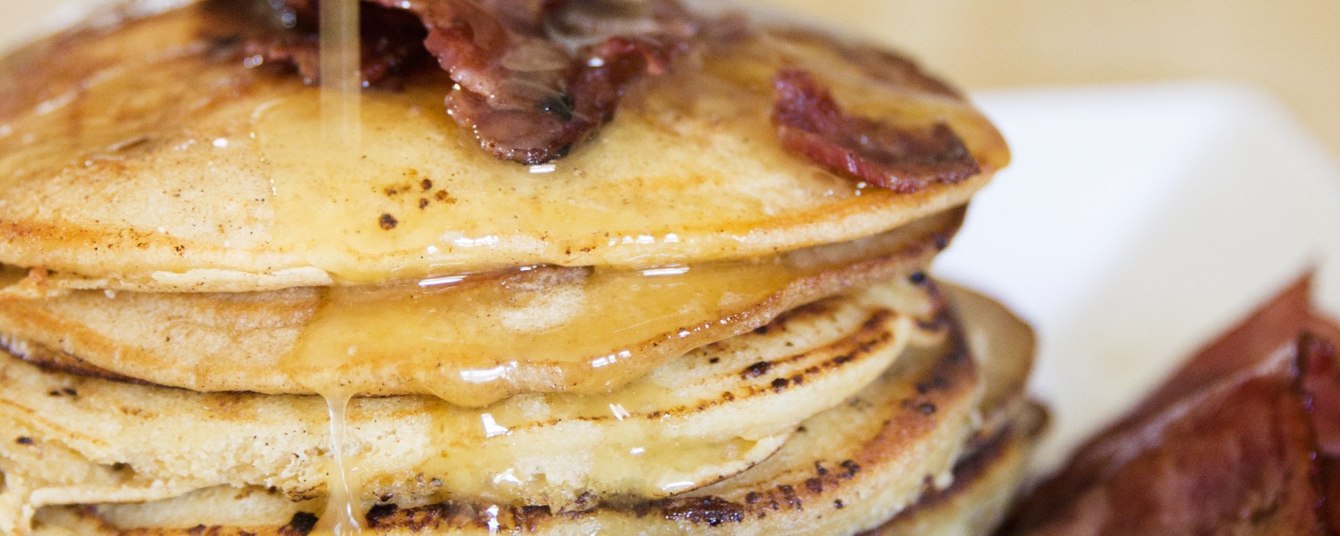 - Stack pancakes on your plate and sprinkle bacon bits on the top.