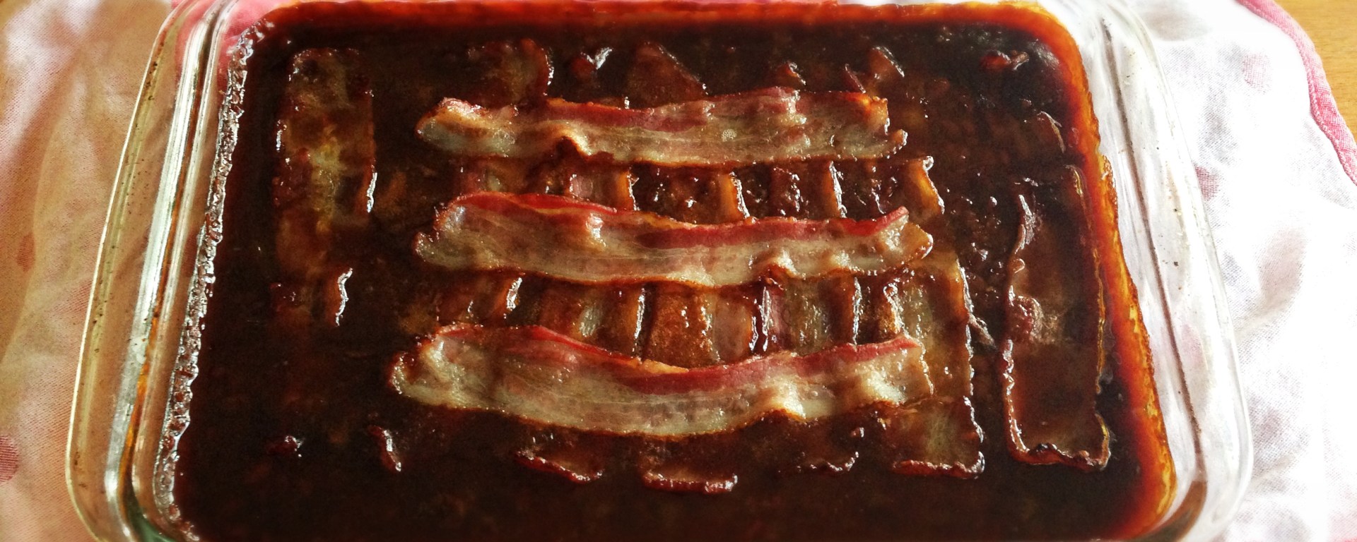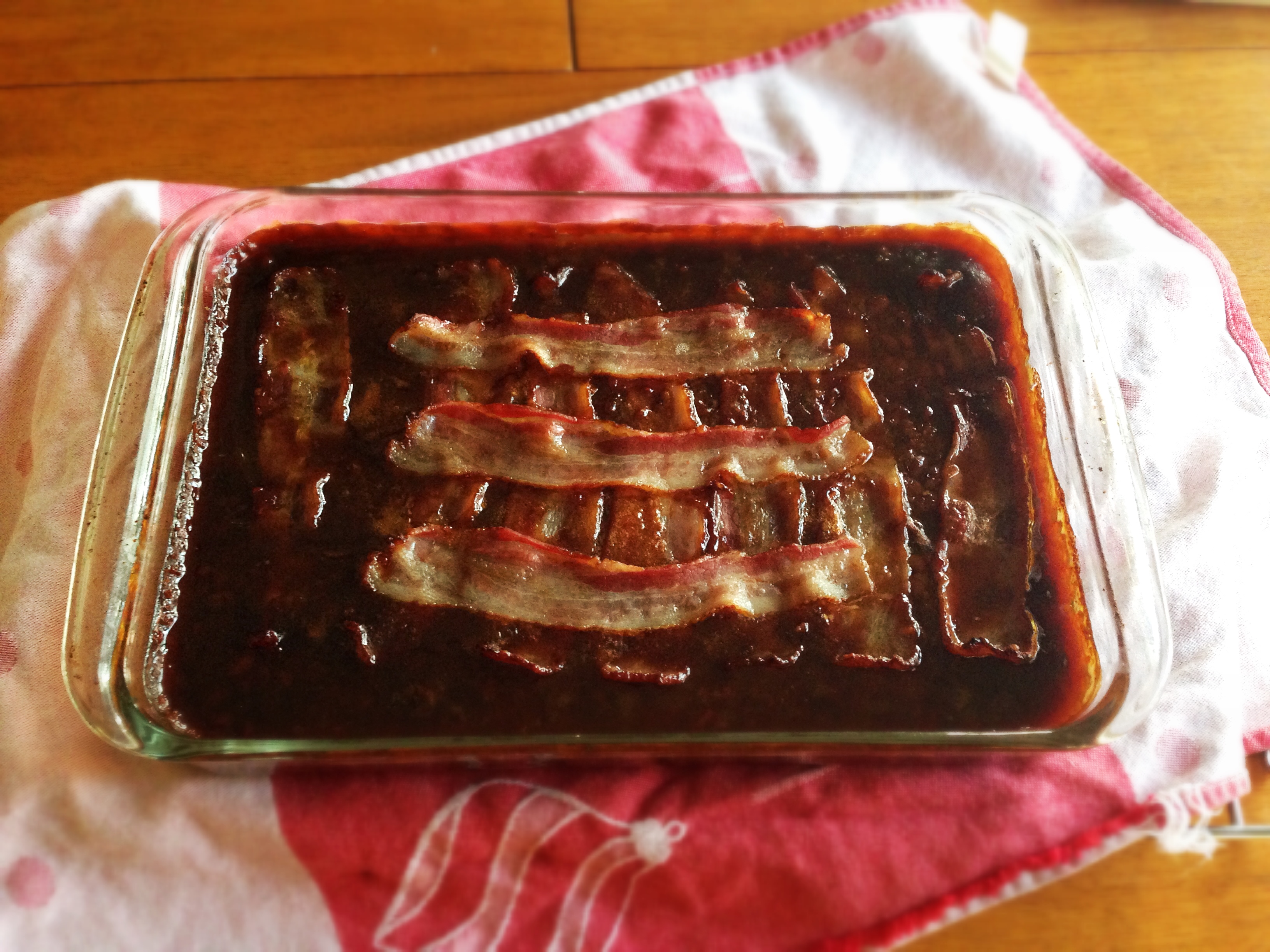 - Transfer bean mixture to a casserole dish and top with strips of bacon. Bake for 1 hour.