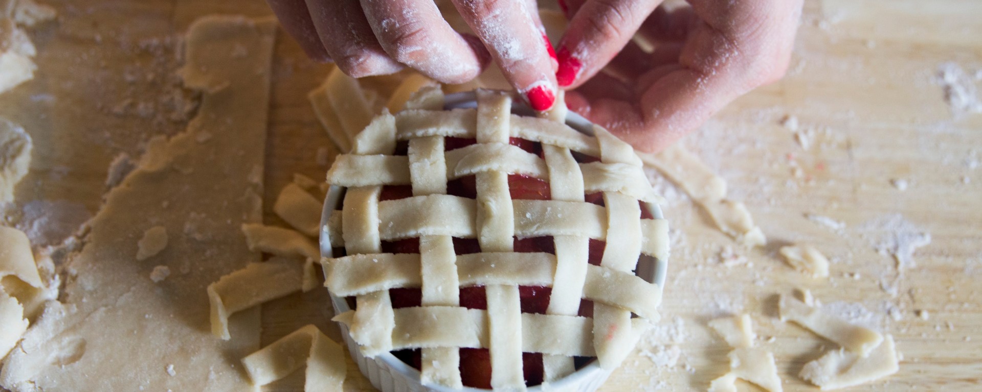 - On a lightly-floured surface, roll out pie dough. Use a knife to slice thin strips for a latticed crust. Drape five strips over the filling, placing each a quarter inch apart. Gently fold every other strip back on itself, a little past the center. Take a long strip and lay it perpendicular to the other strips. Place the strips you folded earlier back on the new strip, pulling every other strip back over the top as you go. Trim any leftover dough hanging off the edges of the ramekin.