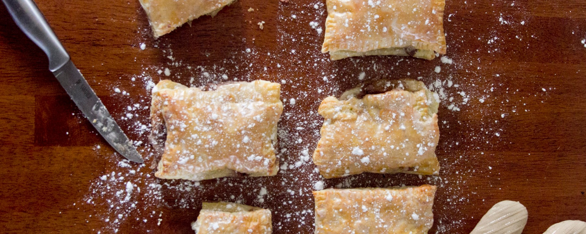 - Roll out 4 sheets of puff pastry until each are about 6” x 10”, then cut into quarters.