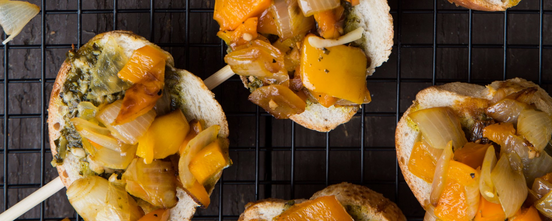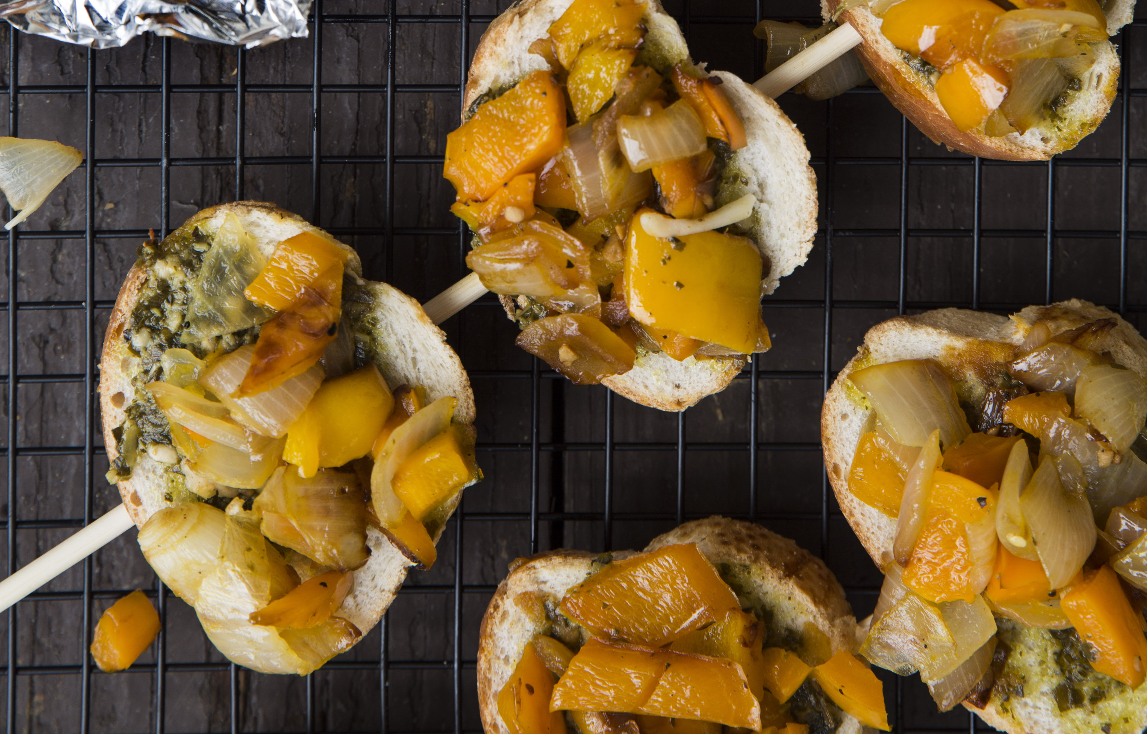 - Spread pesto on baguettes and place about 2 tablespoons of the pepper mixture on top.