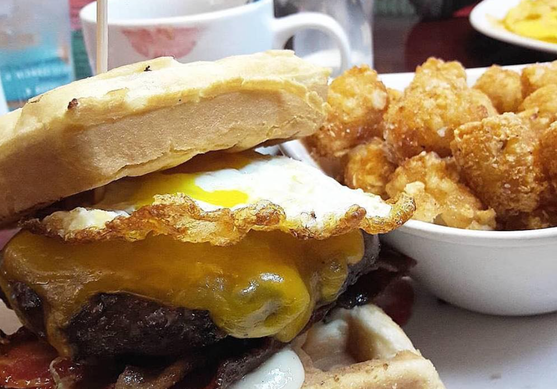 For dinner, there is a choice of chicken riggie poutine, foie gras deviled eggs or a chicken fried tofu and waffles appetizer. For the main course, there is a choice of chocolate praline waffles with a peach compote, a turducken omelet with turkey bacon, duck confit and chicken sausage, or a breakfast burger. The burger is crusted in coffee and served on a waffle with candied bacon and a sunny-side-up egg.