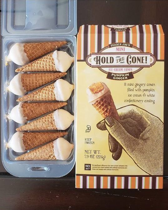 TJ’s infamous mini ice cream cones, “Hold the Cone,” usually come in chocolate or vanilla ice cream and are covered in a chocolate shell. They also make seasonal varieties, and the Pumpkin Ginger variety are delicious. With only 8 mini cones per package, buy more than one package because these will disappear.