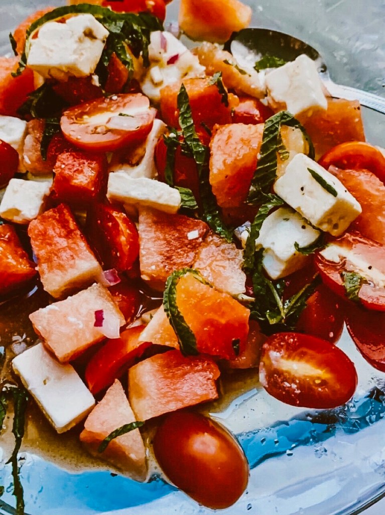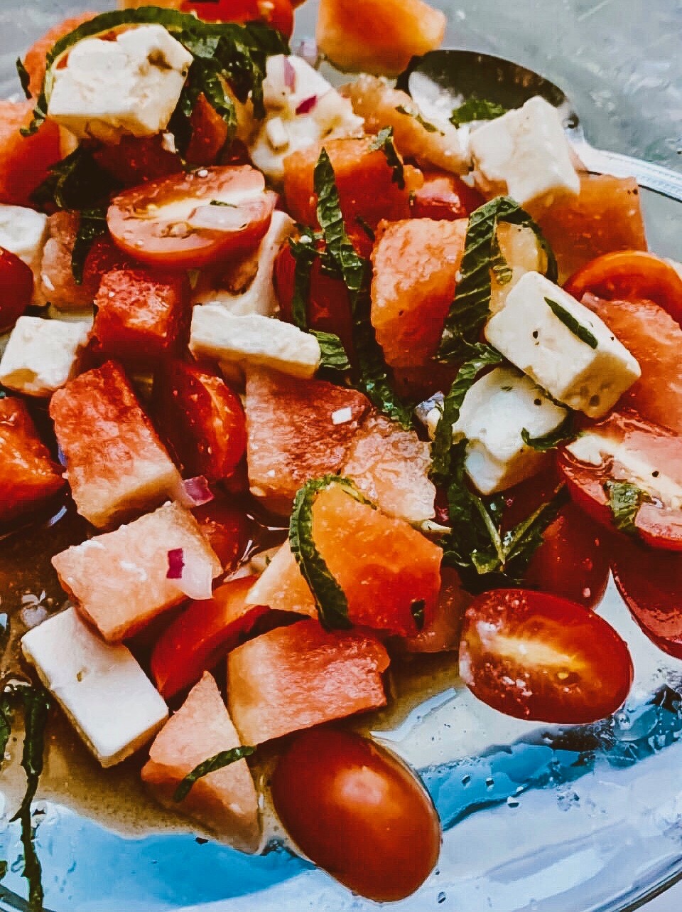 It’s hard to get enough of summer salads, so here is another simple recipe to satisfy those sweet-savory cravings on a hot summer’s day! For this salad, start with room temperature tomatoes-—I prefer heirloom for the vibrant colors—and cold watermelon. The difference in texture and temperature is what makes this salad a success. Finally, add crumbled feta cheese, fresh dill, and a healthy drizzle of olive oil and balsamic vinegar.