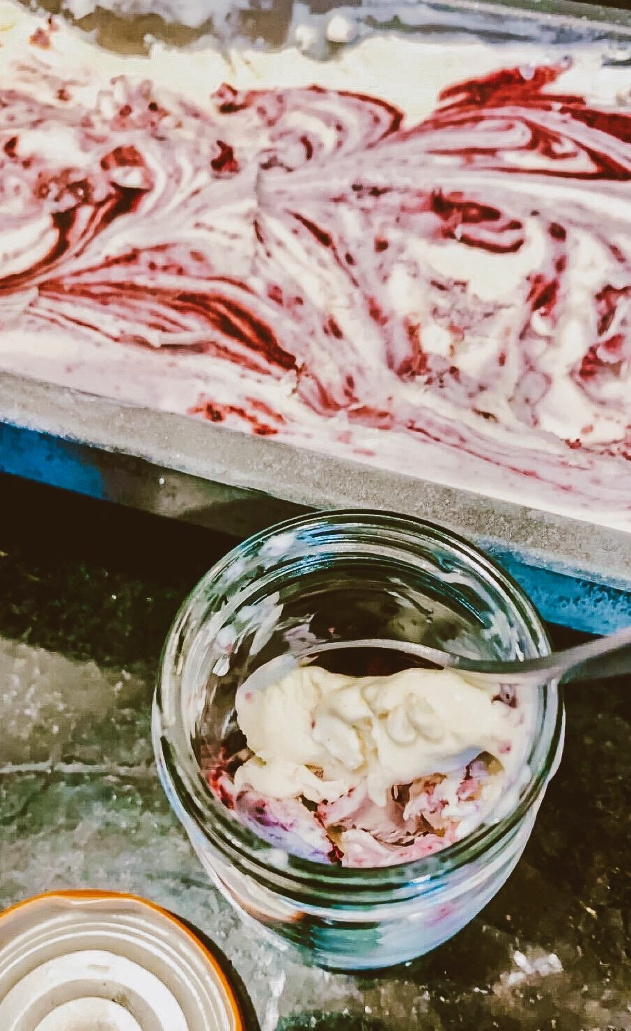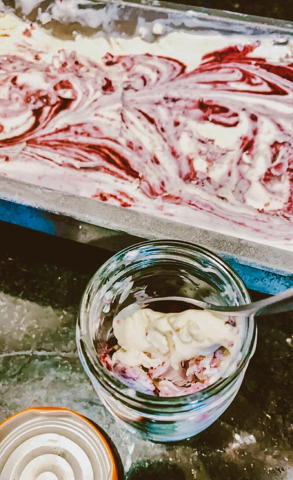 This is hands-down the easiest recipe for ice cream that doesn’t involve an ice cream maker. All that is required is heavy cream, condensed milk, a pinch of salt, and the flavoring of your choice. This recipe can be adapted to make any kind of flavor of ice cream! First, whip the heavy cream until stiff peaks are formed. Then, fold in an entire can of condensed milk—or less depending on your preference of sweetness. Add a pinch of salt and a teaspoon of vanilla extract and then put that mixture into the refrigerator while we get to work on making blueberry syrup. Add blueberries, the juice and zest of one lemon, and white sugar to a saucepan over medium-low heat. Watch closely to make sure that the mixture does not burn. When it has reached a thicker consistency, after roughly 20 minutes of cooking, let it cool completely. Carefully combine it with the ice cream mixture from before, and freeze for a full 24 hours, or until it has set and can be scooped.