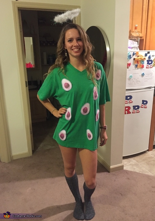 Claiming the top stop for our most creative food-inspired Halloween look is this amazing play on words. Everyone knows this classic saying, but bringing it to life for costume season is a great diy. With a simple green dress and halo headband you can create this fun masterpiece. Hop on your computer and print out a bunch of avocados. Tape them all over your dress, add a few pinches of red detailing to represent the tomatoes and bam, you are a holy guacamole.
