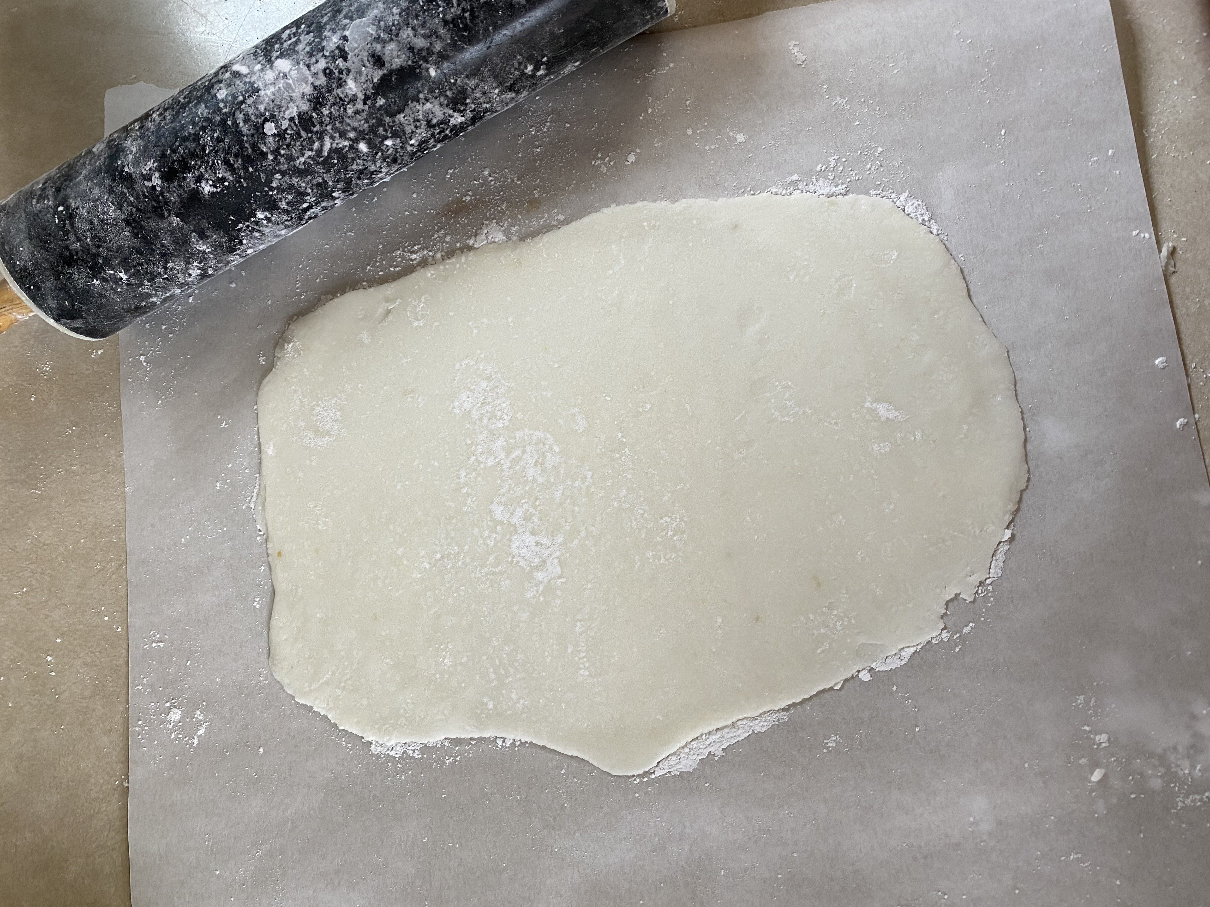 - Take a handful of the dough around the size of a baseball and roll it out with a rolling pin into a thin(ish) oval shape.