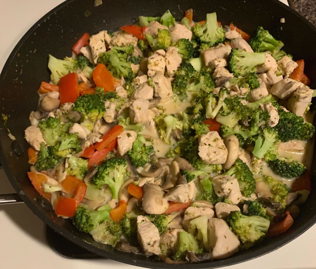 On the night I had to make both dinner and dessert, it certainly was a large undertaking. I decided to make a Funfetti cake with cake batter frosting for dessert, and a creamy keto chicken with vegetables for dinner. First, I made the cake batter and put it into the oven to cook. While the cake was baking, I began to prepare my meal. After the cake was done, I set it aside to cool, assembled the dinner, and began searing it on the stovetop. While also keeping an eye on the main meal, I made the cake batter frosting to decorate my cake with later. I frosted my cake after eating dinner, so I didn’t rush the process. As you can see, I had to keep track of many steps. In order to get everything done by yourself, you have to do several things at the same time. It is crucial to multitask when cooking on your own to create a complete, scrumptious dinner and dessert!