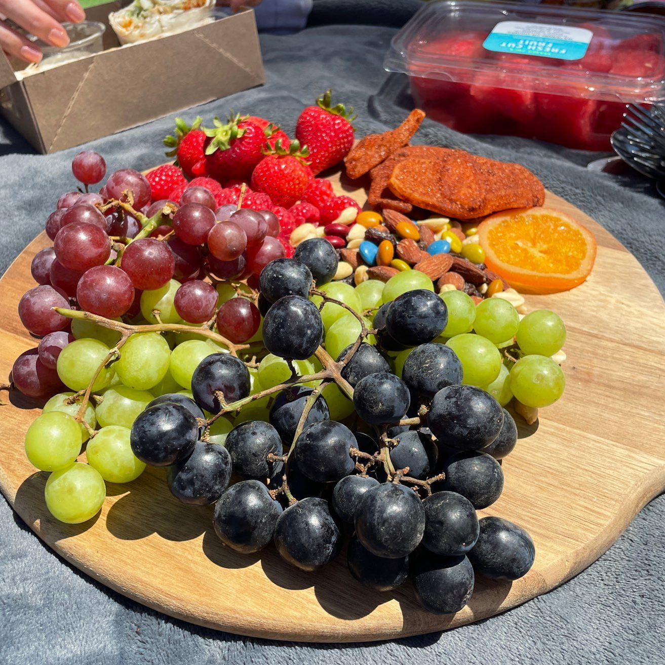 My favorites are strawberries, red grapes, green grapes, and dried apricots. I cut the strawberries down the middle lengthwise to show off the inside and for the red and green colors of the strawberries to be present on the board. For the grapes, I cut off bunches, leave them on the vine, and place them on the board (image five for reference.) I use the dried apricots to fill in any leftover spaces and add some color to brighten up the board!