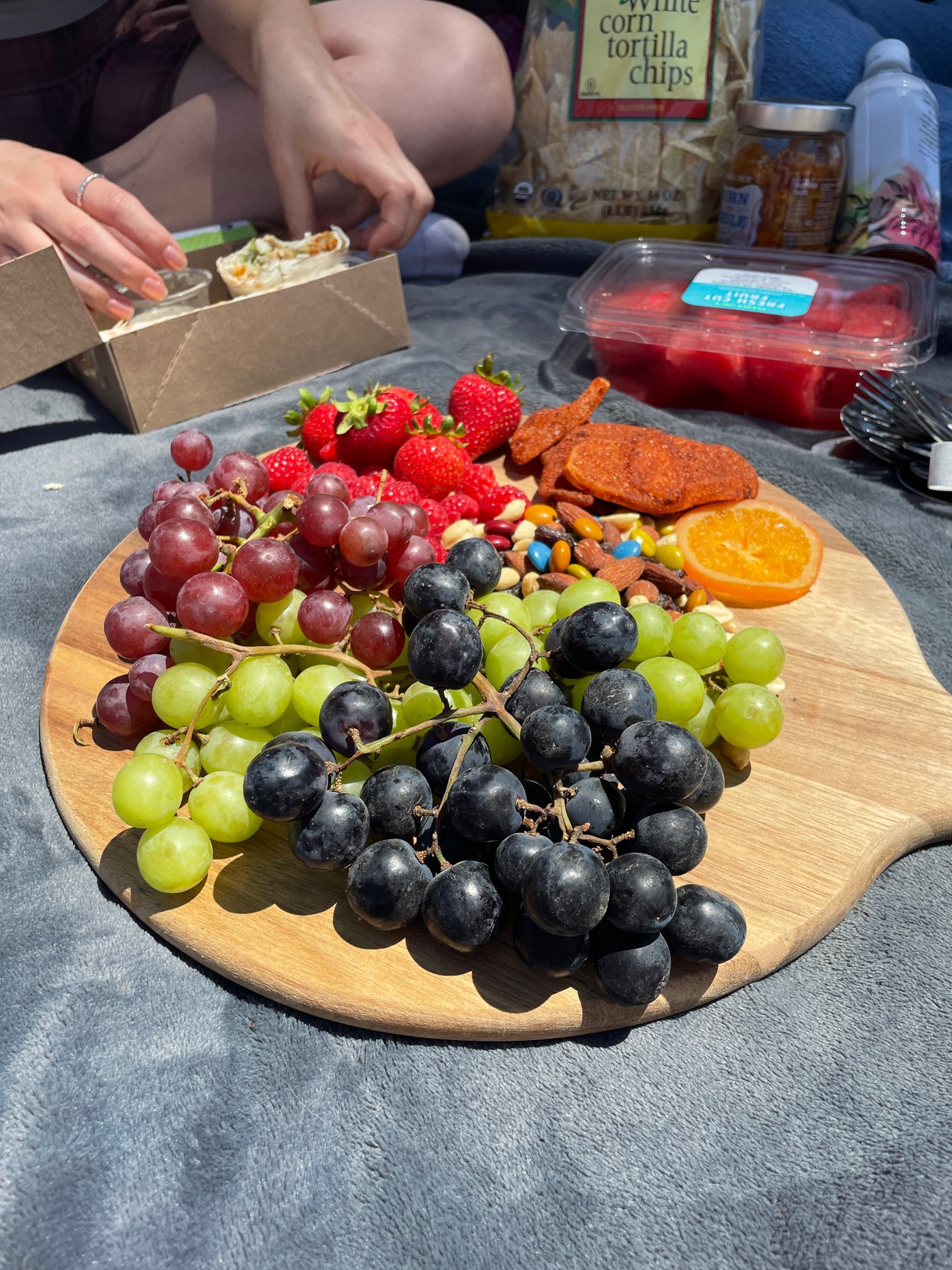 My favorites are strawberries, red grapes, green grapes, and dried apricots. I cut the strawberries down the middle lengthwise to show off the inside and for the red and green colors of the strawberries to be present on the board. For the grapes, I cut off bunches, leave them on the vine, and place them on the board (image five for reference.) I use the dried apricots to fill in any leftover spaces and add some color to brighten up the board!