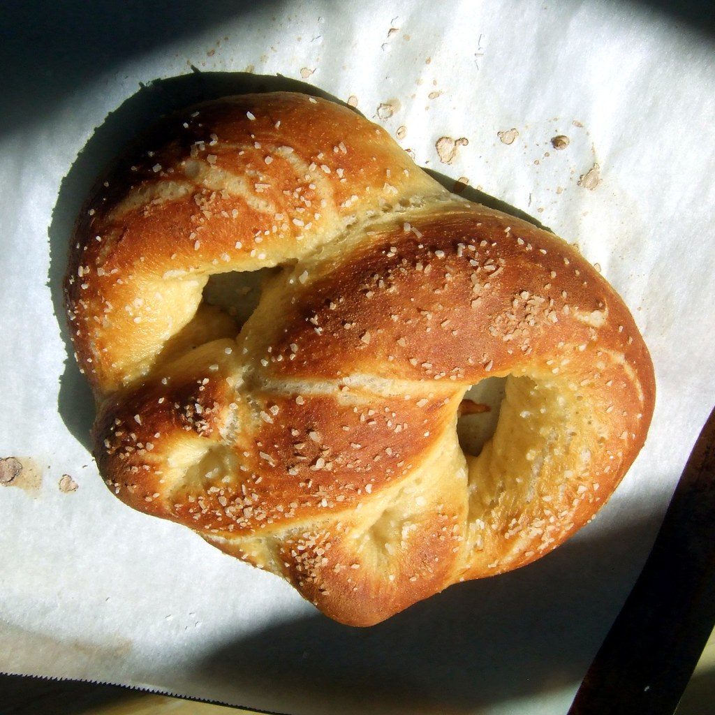 - Punch down the risen dough and divide it into 12 equal pieces. Roll each piece into a long rope and twist it into a pretzel shape.