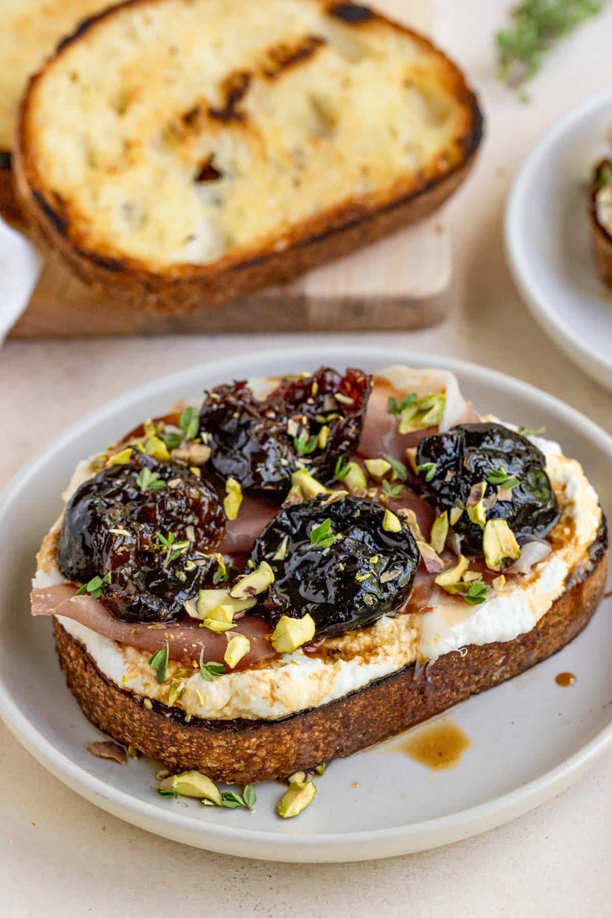 - Once dough has risen, turn out on a well-floured surface and divide into 3 equal pieces. Roll each piece out into a 6-inch x 15-inch rectangle. (Use more flour as needed to make sure dough does not stick to the surface.) Spread fig jam mixture over each rectangle, leaving a ½ inch seam all the way around. Sprinkle prosciutto (or pistachios) and goat cheese on top of jam.
