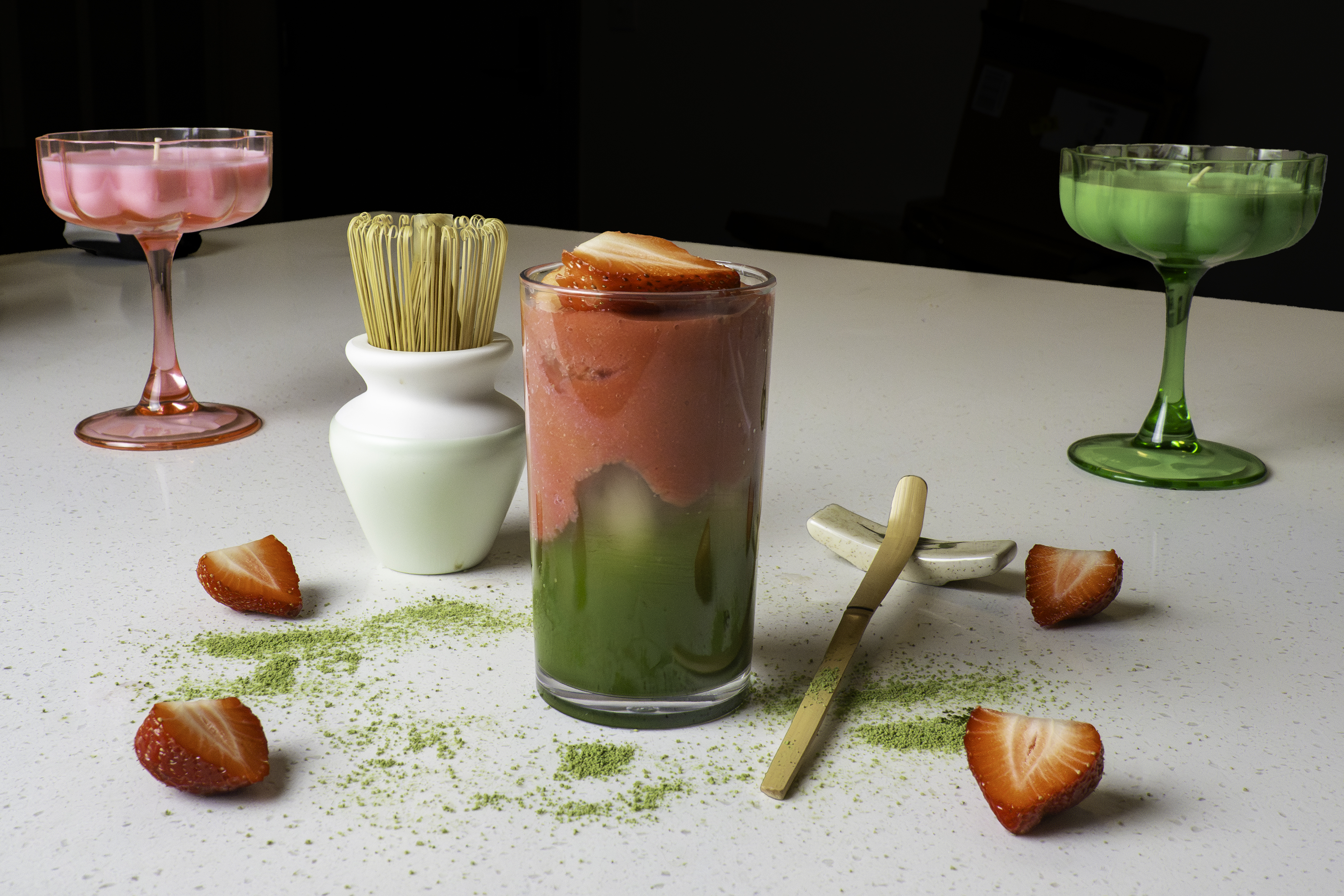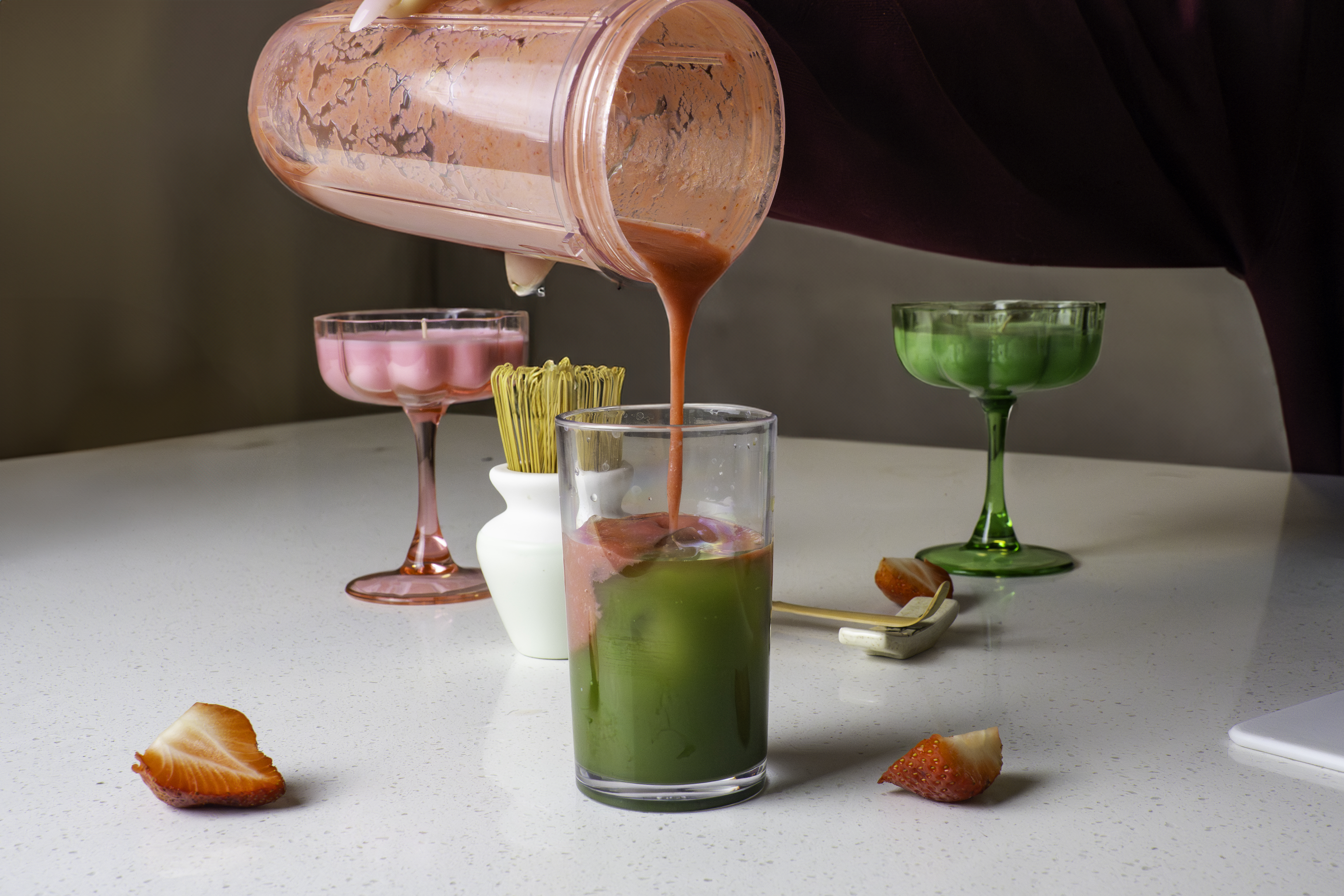 4) Fill a glass with ice cubes, then pour in the strawberry puree until it fills about one-third of the glass. Slowly pour the prepared matcha over the strawberry puree, allowing the layers to form naturally.