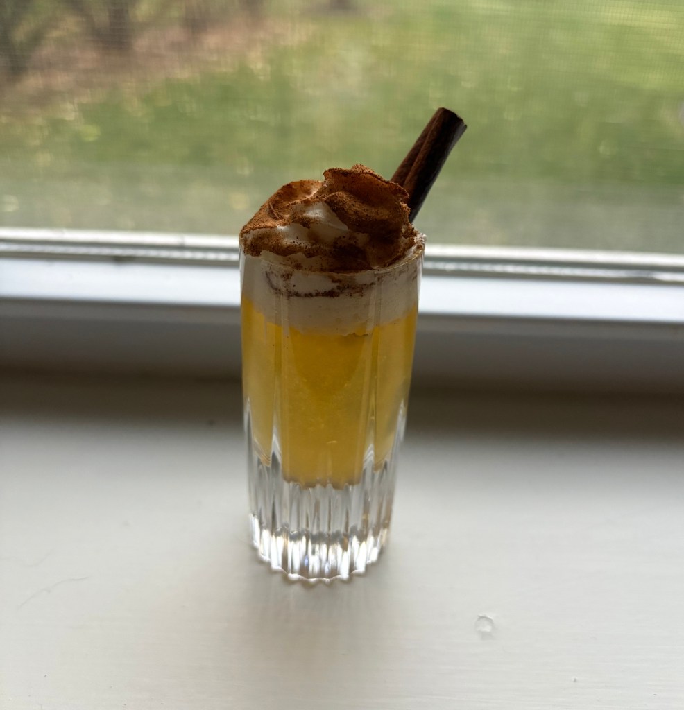 - Finally, top off the shot with a spray of whipped cream, a sprinkle of ground cinnamon, and a cinnamon stick to garnish.