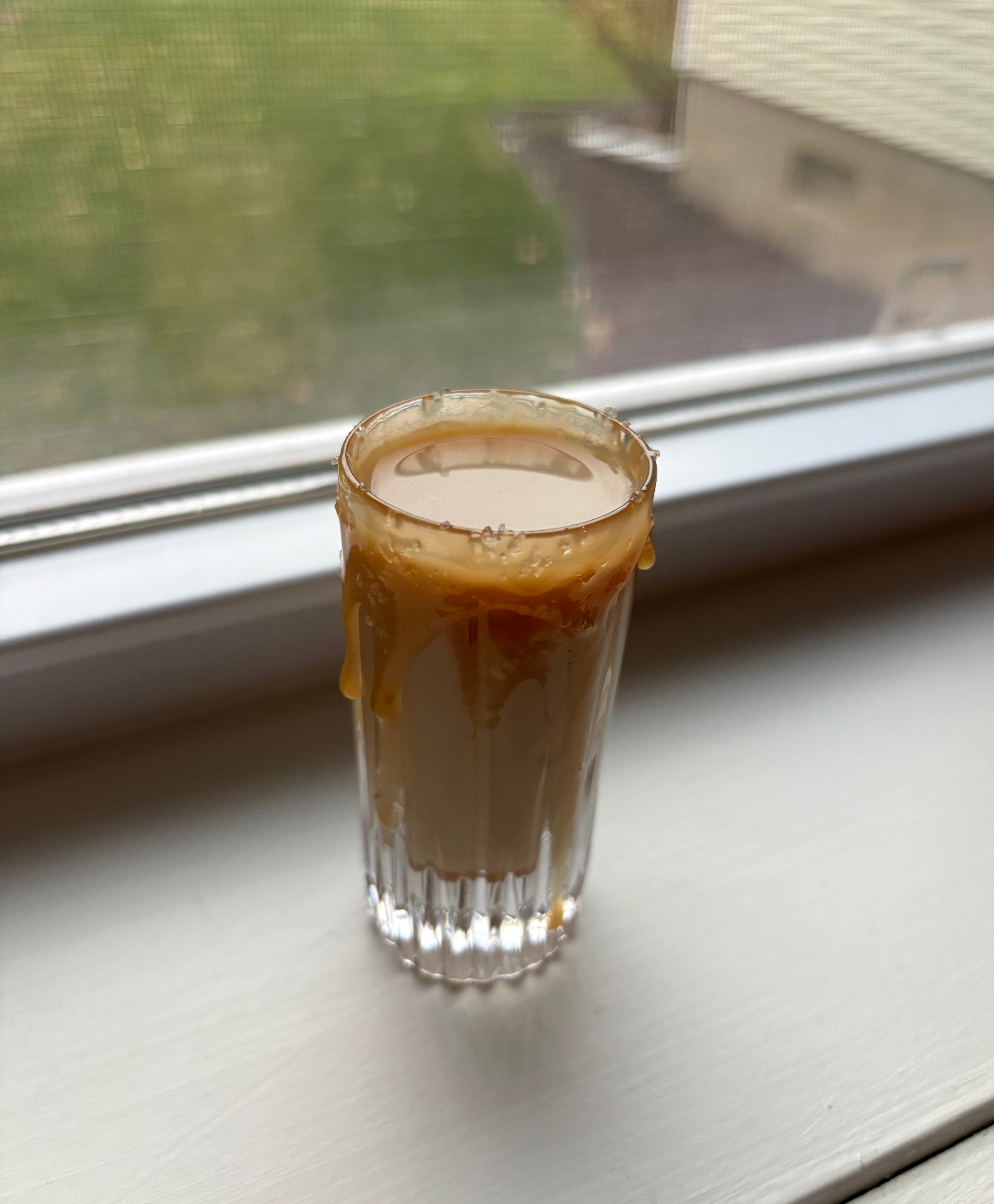 - Beginning with the caramel sauce, pour a little bit onto a plate and roll the rim of your shot glass through it so that the caramel coats the edge. Once this is done, add a pinch of sea salt to top it off. *You can roll the edge of your glass through sea salt like you did the caramel, but it may pick up more than is desired.